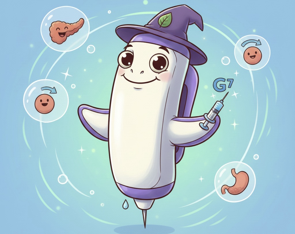 この薬は、GIP/GLP-1受容体作動薬と呼ばれる薬で、週1回の投与で効果が持続するように製剤的な工夫をした注射薬です。血糖値が高くなるとインスリンの分泌を促進し、またインスリンの作用を改善することによって血糖値を下げます。